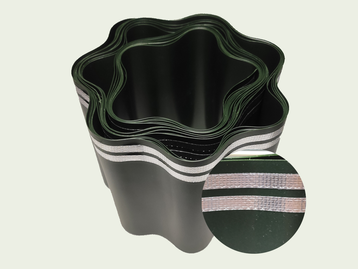 Lawn edge of dark green plastic with two glued strip of current-conducting aluminium foil.